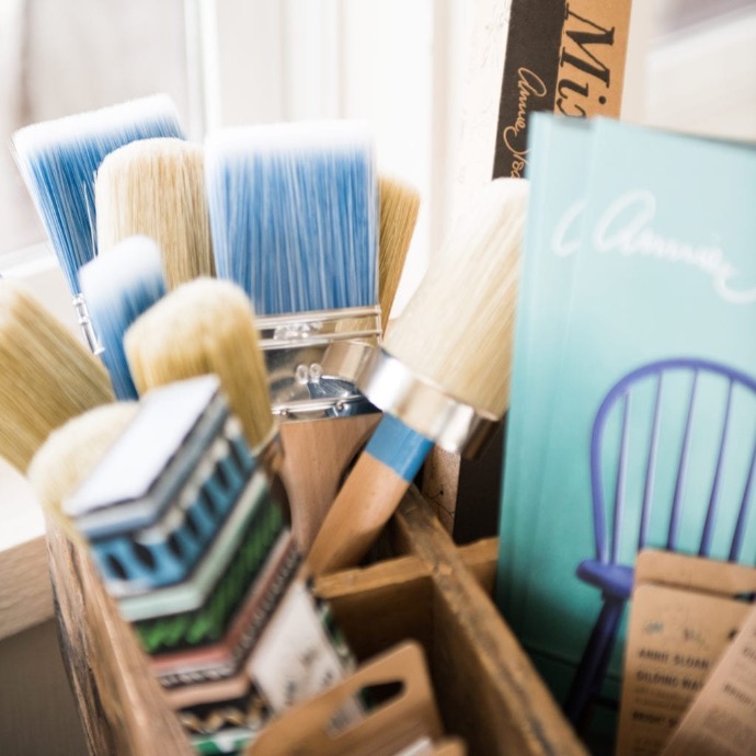 Annie's brushes and tools make painting, waxing, stenciling, and mixing easy and effective. Her ergonomic brushes allow for achieving smooth fine lines or textured brushstrokes with ease. Waxes blend and apply effortlessly with the Annie Sloan wax brush. The oval stencil brush is ideal for applying paint through stencils. Annie's range provides the freedom to create personalized styles, whether desiring a polished finish or visible brushwork. These thoughtfully designed tools enable excellent and imaginative painting, stenciling, and decorating.